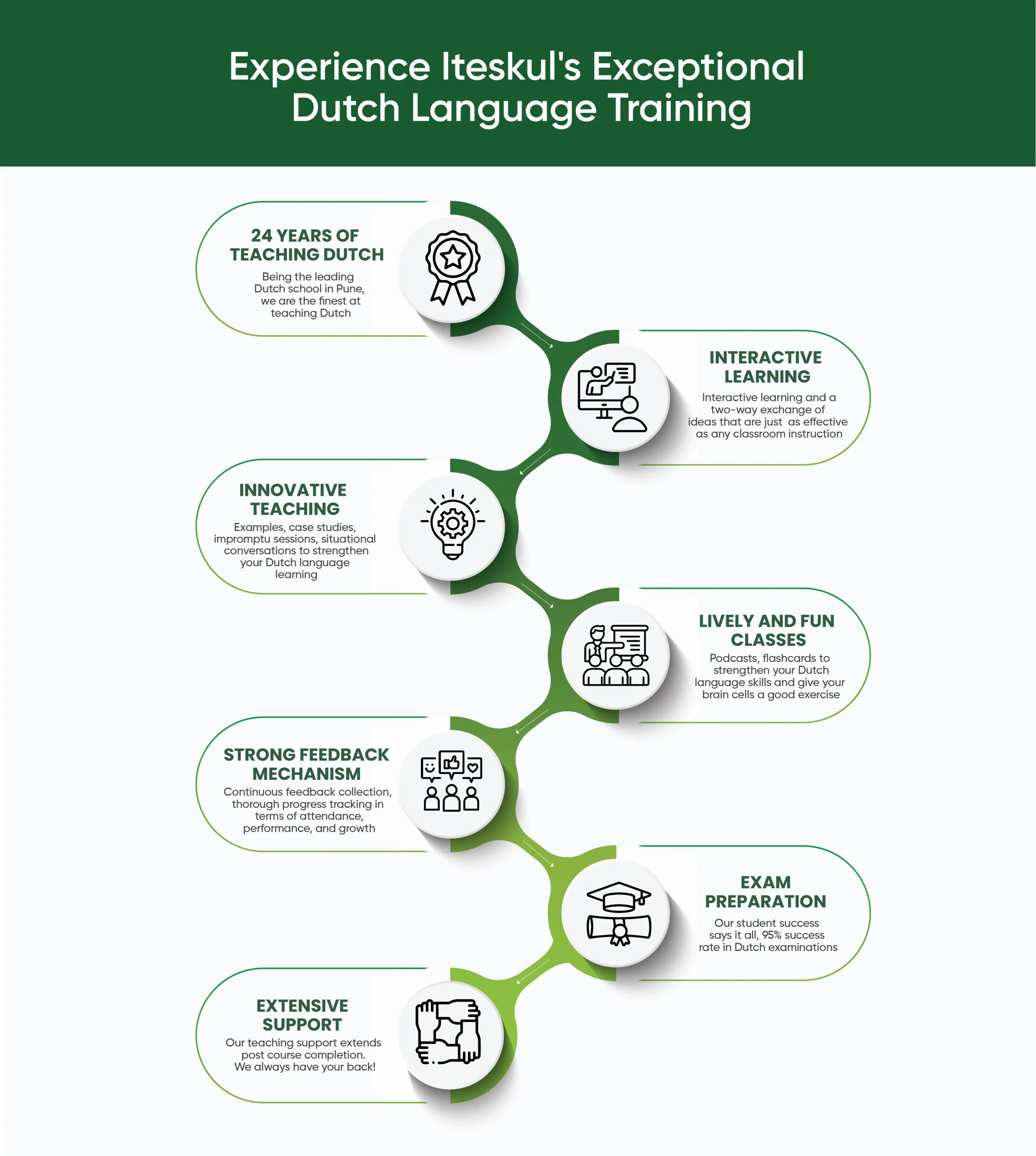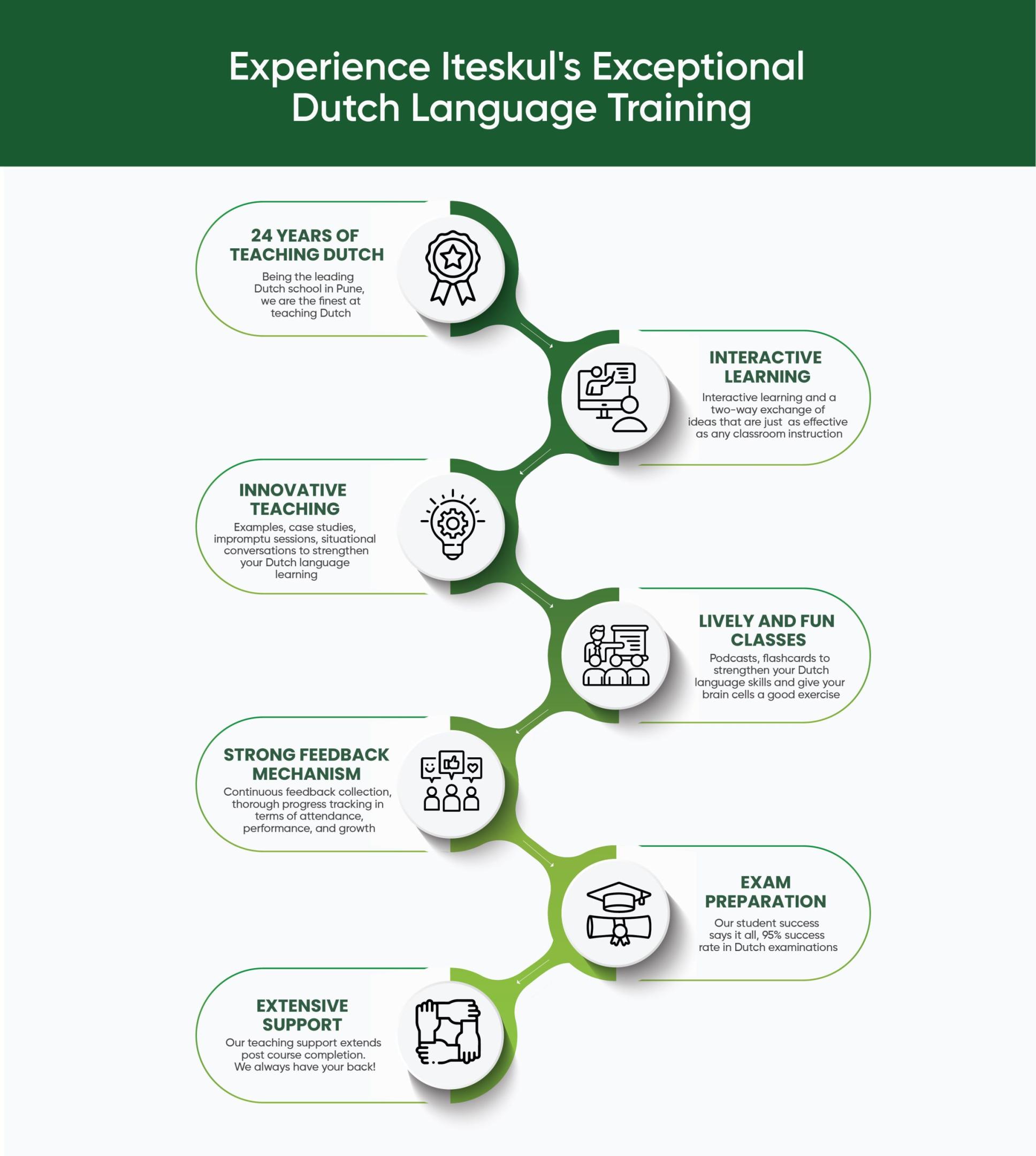 From beginner to intermediate levels, ITESKUL's Dutch language program provides a thorough educational experience (A1-C2). Improve your ability to communicate, learn about Dutch culture, and open doors to new commercial, educational, and cultural exchange opportunities. Our experienced mentors and dynamic teaching strategies foster a positive and stimulating learning environment.